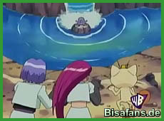 Die Korken, die wie geplant einen zweiten Angriff starten, werden mit einem Donnerschock außer Gefecht gesetzt, was Team Rocket nicht glücklich stimmt, da es immer das Gleiche ist. Als sie jedoch ihren Spruch aufsagen möchten, meint Ash wiederum, dass dieser schon alt ist und Pikachu einen Donnerschock befiehlt. Zusammen mit einer Schallwelle von Krawumms gelingt es, Team Rocket den üblichen Abflug zu bescheren.