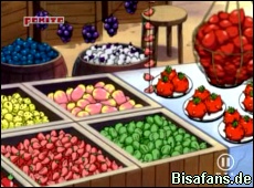 Auf dem Weg zum Restaurant rennt Pikachu schon voraus weil er bei einem Markt leckere Beeren riecht. Kurzerhand gehen alle unsere Freunde zum Markt und bekommen schnell das interessante Marktleben mit. Als Ash jedoch gierig eine Kostprobe probiert, erfährt er zu spät, dass die Beeren eigentlich nur für Pokémon und nicht für Menschen gedacht sind. Ash stößt dabei versehentlich ein Mädchen um, welches daraufhin ihre Tüte mit dem Einkauf fallenläßt. Das Groink des Mädchens kann jedoch mit Psychokinese verhindern, dass etwas auf den Boden fällt.