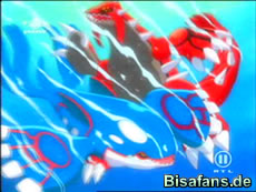 In dem Bereich wo Kyogre sich aufhält tobte bisher ein Sturm und alles Land wurde überschwemmt. Da wo Groudon ist, ist jedoch helles Sonnenlicht und festes Land unter dem Füssen. Kyogre greift Groudon mit einer gigantischen Flutwelle an... Groudon reagiert mit einem mächtigen Solarstrahl, der die Flutwelle auflöst. Wie Siegfried Schlussfolgert, versucht Groudon die Insel zu verteidigen und bat damals Pikachu aus genau diesem Grund ihm zu helfen. Dies war der Grund warum die blaue Kugel mit Pikachu verschmolzen war!