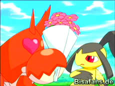 Als alle etwas später zusammen weitergehen sieht Rocko einen Blumenstrauß am Boden liegen. Er will, dass Lombrero diesen dem Flunkifer gibt, damit er sich an Samantha heranmachen kann. Doch statt dessen entpuppt sich all dies als Falle von Team Rocket, die daraufhin mit Vipitis und Tuska angreifen. Ash schickt sein Krebscorps in den Kampf welches Rockos Lombrero unterstützt. Als später auch noch Qurtel zur Hilfe kommt, kann Team Rocket besiegt und Flunkifer befreit werden.