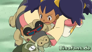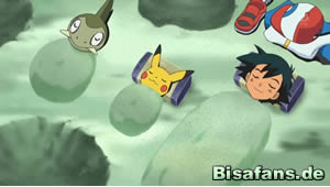 Wenige Schritte später fallen Ash und Lilia schmerzhaft in eine Fallgrube. Diese stammt diesmal jedoch nicht von Team Rocket. Bevor die Sache weiter erklärt wird, gibt es einen Szenenwechsel, bei dem auch Team Rocket in eine Grube fällt und dabei ein Ganovil mit Brille finden.