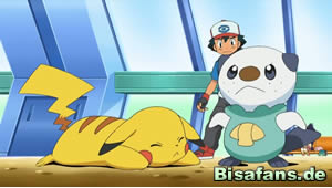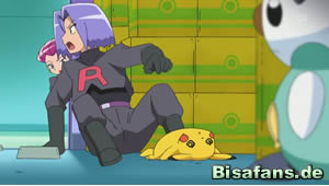 Zwischenzeitlich kann sich Team Rocket ungesehen in das Vorratslager eindringen und macht sich über die sich dort befindenen Güter her. Statt aber die erhofften Vorräte zu finden, stößt James doch tatsächlich über Ashs Freund Pikachu, noch immer von Ottaros nicht bös gemeinten Angriff besinnungslos. Über diesen Fund sehr zufrieden verlassen Jessie und James mit Pikachu in Gewahrsam das Lager, werden aber daraufhin von Ash, Lilia Don George und seinen Mannen gestellt. Mit Pikachu verschwunden und Ottaro völlig von der Rolle erkennt Ash schnell den Ernst der Lage und ergreift die Initiative. Die befohlene Aquaknarre durch Ottaro bleibt aber dank eines Schutzschildes durch eine technische Spielerei Team Rockets ohne sichtlichen Schaden. Floink allerdings gelingt es, die Schutzbarriere durch eine feurige Glutattacke zu durchbrechen und ermöglicht Pikachu somit die Flucht. Doch auch Team Rocket kann ein weiteres Mal entkommen, was angesichts der Befreiung Pikachus aber nicht weiter tragisch erscheint. Außerdem entschließt sich Floink, aus Dankbarkeit Ash gegenüber, diesen von nun an bei seiner Reise zu begleiten. Mit der geballten Kraft des kleinen Feuerpokémons setzt Ash seine Reise fort, sein Ziel klar vor Augen – die Arena von Orion City.