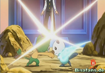 Die Handlung setzt genau dort ein, wo sie in der letzten Episode aufgehört hat. Ashs Ottaro und Bennys Vegimak Auge in Auge. Doch im Moment sieht Ottaro nur eines, nämlich einen energiegeladenen Solarstrahl, der direkt seine Richtung ansteuert. Vielleicht im letzten Moment kann Ottaro – auf Ashs Geheiß hin – seine zuverlässige Muschel zücken und den Solarstrahl seines Gegners ablenken. (An dieser Stelle setzt das Arenamusikthema ein, welches man in den Pokémonspielen in jeder Arena zu hören bekommt.) Benny gibt sich von der Gerissenheit seiner Gegner beeindruckt, entschließt sich nun aber dazu, richtig Gas zu geben. Der Kampf ist also noch lange nicht vorbei.