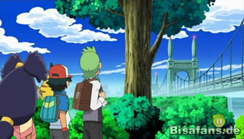 Anmutig erstreckt sich die gigantische Himmelspfeilbrücke über das unter ihr liegende Gewässer. Als letzte Etappe ihrer Reise nach Stratos City machen sich Ash und seine Freunde zuversichtlich auf den Weg, nicht aber ohne dieses kolossale, von Menschenhand geschaffene Bauwerk mit hängender Kinnlade zu bestaunen. Die Reise aber muss weitergehen, schließlich wartet Artie, der Arenaleiter von Stratos City, bereits darauf, von Ash in die Schranken gewiesen zu werden. Daher entschließt man sich nur für einen kurzen Zwischenstopp an einem wegelagernden Geschäft, wo Ash – nach einem kurzen Anruf bei Professor Esche – sein erst kürzlich gefangenes Strawickl für Dusselgurr, die er einige Tage bei der Professorin zur Analyse gelassen hatte, austauscht.