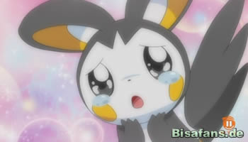 Voltwechsel, so meint Benny, ist eine ganz spezielle Attacke, mit welcher der Anwender aus der Hitze des Gefechts schnell entfliehen und gleichzeitig Plätze mit einem anderen Pokémon tauschen kann – in diesem Fall Stalobor, der alles andere als begeistert davon ist. Man nimmt die Sache mit Humor, Emolga erntet aber dennoch für ihren Ungehorsam erstmalig Schelte von ihrer neuen Trainerin. Und schon glitzern die rührseligsten Krokodilstränen in den Augen des Elektro-Pokémons, funkeln in ihrem arglistigen Glanz Lilia entgegen – man kann doch der süßen Emolga einfach nicht böse sein.