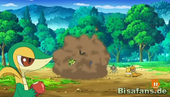 Ein paar pausbäckige Äpfel haben es Emolga abermals angetan, verliebt starrt sie ihnen entgegen. Dummerweise hindern einige grimmige Gestalten die Einfachheit, sich diese Früchte schlichtweg einzuverleiben. Drei wildlebende Kukmarda sind über den Eindringling und ihr Gefolge ganz und gar nicht glücklich. Wieder einmal schafft es Emolga allerdings, sich aus der Affäre zu ziehen und lässt ihre männlichen Begleiter die Drecksarbeit für sie verrichten. Diesmal aber geht der Plan nach hinten los – das Getümmel um die leckere Nachspeise reißt ein um den Mittagsschlaf gebrachtes Grillchita unsanft aus dem Schlaf. Das Kukmarda-Trio sucht Hals über Kopf die Flucht, Ottaro baut sich dagegen schützend vor Emolga auf – und erntet sogleich die volle Ladung von Grillchitas loderndem Zorn und geht K. O.. Eine Verfolgungsjagd zwischen Emolga und Grillchita beginnt, deren bereits zu Ungunsten drohendes Ende von Emolga glücklicherweise im letzten Moment durch den rettenden Eingriff durch Serpifeu noch abgewendet werden kann. Von dem Kampfgetümmel unlängst aus dem Schlaf gerissen, eilen nun auch Ash und der Rest der Gruppe Serpifeu zur Hilfe. Serpifeu kann einige Treffer landen, unterliegt aber immer mehr ihrem übermächtigen Gegner. Emolga, die bereits erbittert mit dem Gedanken spielt, Heil in der Flucht zu suchen, schafft es dann allerdings doch, über ihren Schatten zu springen, greift in das Kampfgeschehen ein und bewahrt Serpifeu vor weiteren Treffern. Mit vereinter Kraft schaffen es die beiden Mädels schließlich, Grillchita soweit einzuschüchtern, dass es zähneknirschend von dannen zieht.