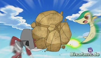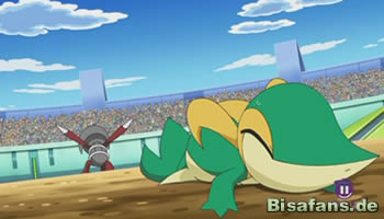 Serpifeu präsentiert sich im milden Sonnenlicht dieses Morgens sehr gelassen, zuversichtlich wie auch völlig von den klingengleichen Gliedern von Gladiantri, ihrer Gegnerin, unbeeindruckt. Serpifeus Auftakt in Form eines Wirbelwindes aus Blättern scheitert dank Gladiantris Metallklauen, die das scharfe Blattwerk regelrecht vom Himmel pflügen. Eine Konterattacke von Serpifeu wird bereits im Keim erstickt, als sich Gladiantri in den Nahkampf wagt und mit blitzenden Klingen ihre Gegnerin zielsicher ins Verderben stürzt. Anziehung als die Trumpfkarte des Pflanzen-Pokémons scheitert dummerweise an der „schwesterlichen Liebe“, die Gladiantri für ihre Kontrahentin bereithält. Ash sieht sich unterlegen, glaubt aber noch immer fest an den Sieg und schenkt Serpifeu sein Vertrauen; Vertrauen, das nicht enttäuscht wird: Gladiantris nächste gefährliche Attacke, bei der sich das Stahl-Pokémon torpedogleich auf seine Gegnerin stürzt, wird nach einem geschickten Ausweichmanöver von Serpifeu mit einem Ausflug ins harte Erdreich belohnt. Wie eine Hacke tiefe Furchen in den Garten eggt, so schlägt auch die rassiermesserscharfe Klinge an dem Kopf von Georginas Pokémon eine Bresche in den aufgewühlten Boden. Betäubt von diesem missglückten Rammmanöver und einem der aufgewirbelten Felsbrocken, der sich bleischwer in Gladiantris Kopfklinge verankert hat, geziert, taumelt das Stahl-Pokémon benommen zurück – die Chance für Ash und Serpifeu, ihr Comeback zu starten. Ashs Pokémon verfällt in einen regelrechten Kampfrausch, als ihre Ranken wie Peitschenhiebe auf ihre wehrlose Widersacherin eindreschen. Durch ein waghalsiges Manöver gelingt es Gladiantri allerdings, sich der Stärke ihrer Gegnerin zu bedienen und dank einer vorschnellen Laubklinge der schweren Last auf ihrem Kopf Lebewohl zu sagen. Befreit von diesem unnützen Laster kehrt Georginas Pokémon wieder taufrisch in den Kampf zurück. Serpifeu versucht, wieder etwas Distanz zwischen sich und den tückischen Klingen ihrer Gegnerin zu gewinnen, scheitert allerdings bei der Durchführung ihres Rankenhiebes und findet sich daraufhin im Sande der Arena wieder. Ein letztes Mal noch blitzen Gladiantris Klingen auf und zielen auf die niedergestreckte Serpifeu. Das Ende ...?