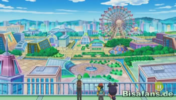 Was lange währt, wird endlich gut: Vor Ash, Benny, Lilia, Mauzi, Milza und Pikachu türmen sich die prächtigen Hochhäuser und das Wahrzeichen der Stadt, das nicht weniger ansehnliche Riesenrad, der Prunkmetropole Rayono City auf. Die Gruppe betrachtet das Herz der Einall-Region mit gemischten Gefühlen, denn während es Ash magnetisch in Richtung der hiesigen Arena zieht, klagen schwelende Füße und knurrende Mägen all seiner Freunde nach einer Pause. Letztendlich lässt sich Ash von seinen protestierenden Freunden wie auch von seinem eigenen Bauch dazu breitschlagen, dem Pokémon-Center der Stadt einen Besuch abzustatten.