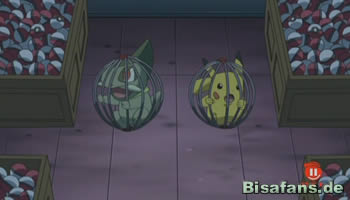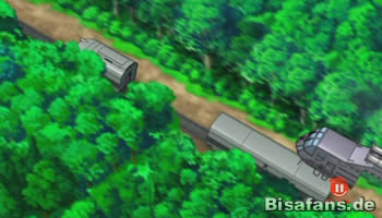 Während sich Jessie, James und Mauzi im Schutze ihres Fluchtfahrzeugs in Sicherheit wiegen, unternehmen Pikachu und Milza in dem von Team Rocket kontrollierten Waggon verzweifelte Fluchtversuche. Weder aber beugt sich die schwere, zentimeterdicke Waggon-Tür vor den unbeugsamen Schreien nach Freiheit aus den Kehlen beider Pokémon, noch vor deren zerstörerischer Wut, die sich in Form von vernichtenden Attacken manifestiert. Wie es der Zufall aber will, spielt sich Pikachu einen von Ashs gestohlenen Pokébällen, die sich mitsamt aller anderen der widerrechtlich angeeigneten Pokébällen aus dem Pokémon-Center im Waggon befinden, direkt in die Hände. Aus dem inneren der Kapsel befreit sich Serpifeu; weiter geht es mit Stalobor, Vegimak, Floink, Kiesling und Lithomith. Der verbündeten Kraft der endlich wieder vereinten Gefährten kann die schwere Stahltür nicht lange Paroli bieten und kapituliert schließlich. Natürlich werden die Zugführer schnell über das Treiben hinter ihrem Rücken hellhörig, halten aber weiterhin eisern an den Gedanken ihrer Flucht fest. Speziell Pikachu, der offenbar keine Sekunde daran geglaubt hat, dass sich Mauzi tatsächlich auf ihre Seite geschlagen hat, reagiert mit überkochender Wut auf die verhöhnenden Worte von seinem tagelangen Reisegefährten. Eine direkte Konfrontation mit dem Ränkeschmied scheitert allerdings an einer weiteren Stahltür, die der letzten in Sachen Widerborstigkeit in nichts nachsteht. Die Gemüter beruhigen sich nur langsam und dennoch schafft man es nach kurzer Zeit, endlich wieder einen klaren Gedanken zu fassen. Höchste Priorität genießt es, Ash und die anderen wiederzufinden. Entschieden wird die Kopplung, die Waggon und Triebwagen miteinander verbindet, kurzerhand gekappt – der erste herbe Rückschlag für Team Rocket, denn der Waggon mit ihrer Beute rückt Sekunde um Sekunde in immer weitere Distanz.