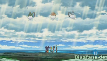 In den Schatten lauernd, beobachtet Team Rocket, die Drahtzieher des Ganzen, aus sicherer Entfernung das Schauspiel, das sich am Himmel abspielt. Trotz der Zerstörungswut, deren die Insel Milos bereits zum Opfer gefallen ist und schwer gezeichnet ist, frohlockt das Trio und lacht sich insgeheim schwer ins Fäustchen, denn gibt es keine Abweichung in ihrem sorgfältig ausgearbeiteten Plan. Alle drei Legenden haben sich versammelt. Die nächste Phase kann beginnen.