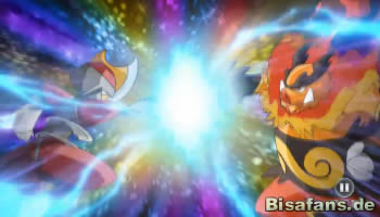 Das Explodon-Turnier geht weiter, nachdem die letzte Episode im 8. und letzten Kampf der 1. Runde abbrach. Bells Flambirex und das Meistagriff von Diaz standen sich darin gegenüber, bevor die Episode nach einem möglicherweise verheerenden Steinkante-Angriff von Meistagrif endete. In den ersten neuen Szenen der Episode kann man sehen, dass Flambirex die Attacke, nach einer Anfeuerung durch Bell, übersteht! Selbst Diaz staunt, dass Flambirex diese Attacke nicht nur aushalten, sondern sogar fangen konnte. Die so gefangenen Steinkante-Steine werden nun mit einer Schleuder-Attacke auf Meistagrif geschleudert, der seinerseits diese mit seiner Betonsäule zurückwirft. Flambirex nutzt diese Gelgenheit um auf Meistagrif loszustürmen und ihm seine zwei Betonsäulen zu entwenden. Diaz bleibt nichts anderes übrig als zähneknirschend seine Niederlage gegen Bell (!) einzugestehen. Wer hätte mit so einem Ausgang gerechnet?
