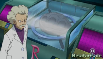 An Bord des Hubschrabers stellt sich Doktor Zager von Team Rocket vor und enthüllt seinen Plan. Er will das Schildfossil mit Hilfe einer von ihm konstruierten Fossilien-Wiederbelebungsmaschine zurück ins Leben rufen! Die notwendigen Materialien klaute sich Team Rocket in den vergangenen Episoden u.a. in der Elektrolithhöhle zusammen. Da hierzu auch die Computerdaten von Professor Esche und Professor Vivian gehören, darf zumindest angezweifelt werden, dass diese Maschine alleine ein Werk von Doktor Zager ist. Da Doktor Zager speziell Ferris für das Finden des Fossils so dankbar ist, enthüllt er noch mehr von seinem Plan. So hat er von einer Raum-Zeit-Krümmung am Wendelberg erfahren, welches wie ein Tor durch die Zeit funktionieren kann. Über dieses Zeittor will Team Rocket an seltene Pokémon herankommen und letztlich die Welt kontrollieren.