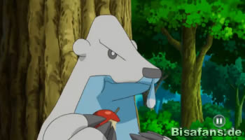 Ein Stückchen weiter entdecken unsere Freunde ein Siberio bei einem Baum und sehen, wie dieses genüsslich einen Apfel nach dem anderen verschlingt. Ganz klar, dies muss das Pokémon sein, dessen Spuren sie vorhin fanden. Benny stellt die Vermutung an, dass dieses Siberio das Petznief geklaut haben könnte, da es das Petznief für seinen Rudel wollte. Da ein ausgewachsenes Siberio allerdings niemals durch den kleinen Tunnel passen könnte, wird diese Möglichkeit kurz darauf verworfen. Die Suche geht weiter.