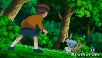 Im Wald kommt es zu einer weiteren kleinen Reiberei zwischen Ottaro und Plinfa, die jedoch von Meloetta mit einem Lied beschwichtigt werden kann. Neue und ziemlich große Fußspuren sowie angeknabberte Äpfel lassen Benny zu der Vermutung kommen, dass Petznief von einem großen Pokémon entführt worden sein konnte. Einwände seiner Freunde dahingehend, dass so ein großes Pokémon nicht durch das kleine Loch in der Mauer beim Pokémon-Haus gepasst hätte, ignoriert Benny erst einmal. Mit Hilfe von Lilia werden nun Beerenbäume gesucht, von denen die Früchte stammen konnten.
