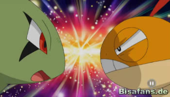 Als unsere Freunde Chris erklären, dass Pokémon durch Kämpfe viel lernen und eine starke Beziehung zu ihren Trainern aufbauen können, startet Ash und sein Zurrokex einen Trainingskampf gegen das wilde Larvitar. Schiedsrichterin ist Lucia. Einen Augenblick später startet Zurrokex dann auch schon mit einer Kopfnuss. Larvitar bleibt nicht untätig und reagiert mit einem Biss, woraufhin Zurrokex einen Turmkick startet. Das Larvitar wird immer wieder von Petznief angefeuert, welches mehr als deutlich sein Freund ist. Nach einem verpatzten Turmkick muss Zurrokex einen Sandsturm einstecken. Als dann zwei Attacken der beiden Pokémon aufeinandertreffen und beide zu Boden gehen, erklärt Lucia den Kampf als Unentschieden.