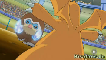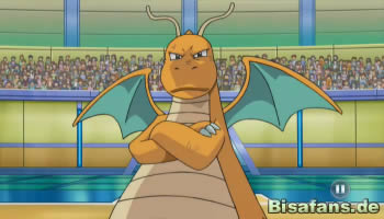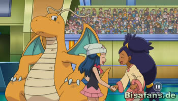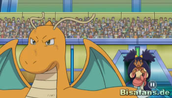 Mit einem Eiszahn von Mamutel will Lucia den Kampf zu einem Ende bringen. Lilia gibt schon keinen Befehl mehr, da sich Dragoran ohnehin der Attacke frontal stellen wird. Diesmal ist es jedoch besonders gefährlich, da Dragorans Hände durch den Griff auf den Eiszahn zu gefrieren drohen. Im letzten Moment hebt Dragoran ab und startet einen Drachenstoß-Angriff aus der Luft, der Mamutel direkt besiegt. Was für ein spektakuläres Ende! Lilia selbst kann sich nur bedingt freuen, da sie praktisch keine Rolle bei diesem Sieg spielte, doch als Lucia ihr gratuliert, schaut nur Dragoran etwas verwundert.