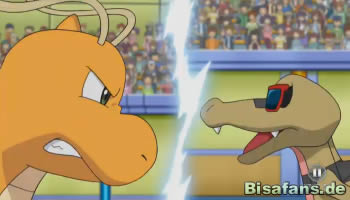 Nach einigen weiteren Flammenwürfen folgt ein Schaufler von Rokkaiman, nach dem es Dragoran erfolgreich mit einem Knirscher in den Schwanz beißen kann. Mit relativ viel Mühe kann Dragoran Rokkaiman loswerden, verfehlt es jedoch mit dem folgenden Eisstrahl. Eine Steinkante von Rokkaiman trifft zwar, doch geht Dragoran anschließend selbst in den Gegenangriff. So tobt der Kampf noch eine Weile weiter und alle Zuschauer wundern sich, weshalb Dragoran plötzlich allen Befehlen von Lilia folgt.