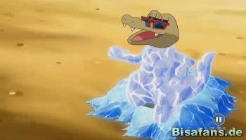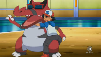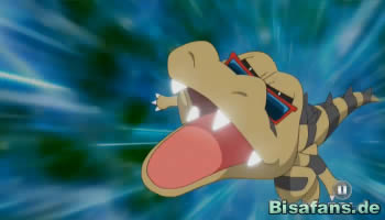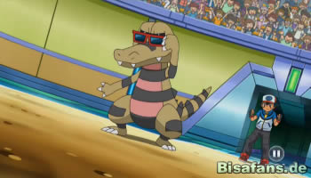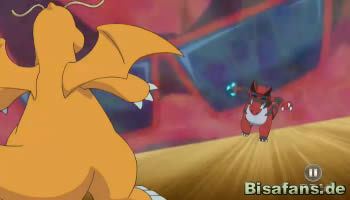 Später kann Dragoran einen Eisstrahl erfolgreich einsetzen, was dazu führt, dass Rokkaiman eingefroren wird. Ein Flammenwurf taut Rokkaiman jedoch unmittelbar darauf wieder schmerzhaft auf. Ist das die entscheidende Wende im Kampf? Nun, für Ash auf jeden Fall, denn sein Rokkaiman beginnt zu leuchten und entwickelt sich zu seiner finalen Stufe, Rabigator, weiter! Lucia prüft natürlich die Daten im Pokédex nach der Entwicklung.