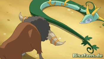 Im Kampf steckt Bisofank tapfer einen mächtigen Solarstrahl von Serpifeu ein. Das überrascht alle Zuschauer, denn scheinbar hat ihm diese Attacke nichts ausgemacht, sondern, im Gegenteil, seinen Kampfgeist geweckt! Diaz ist der erste, der erkennt, dass dies an Bisofanks Spezialfähigkeit Vegetarier liegt, die Pflanzen-Attacken in Angriffskraft umwandelt. Es folgt eine Drachenrute von Serpiroyal, doch auch die steckt Bisofank regungslos weg. Serpiroyal schaut sichtlich überrascht, doch Diaz gibt noch nicht auf und befiehlt einen Silberblick, der die Verteidigung von Bisofank schwächen soll. Mit der nun folgenden Drachenrute muss der Sieg folgen, da ist sich Diaz sicher. Doch außer Lob von Lauro für eine gut ausgeführte Attacke, gibt es den Hinweis, dass Bisofank kein normales Pokémon ist, sondern das Pokémon eines Champions. In diesem Moment schreckt selbst Diaz etwas zurück.