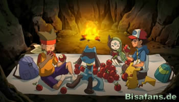 Etwas später folgt die Gruppe einem Pfad. Als Carsten jedoch plötzlich meint, das Meer riechen zu können, nimmt man eine vermeindliche Abkürzung durch den Wald. Diese führt am Ende zu einer großen Wiese, was die beiden natürlich total überrascht Immerhin können die beiden so ihre Sternenkenntnisse unter Beweis stellen, indem sie ein Bisofank- und Cerapendra-Sternenbild erkennen. Anhand dieser Sternenbilder kann Carsten sogar die Position von Norden und der Arena ermitteln. Einen Abhang kann Carsten leider nicht erkennen, so dass es nun an Ash liegt, Carsten aus einem Abhang hochzuziehen. Offenbar ist Carsten etwas kräftiger, denn Ash braucht die Hilfe von Pikachu und Riolu um Carsten hochzuziehen, während Carsten es vorher alleine schaffte. Nun ja, oder Carsten wiegt mehr