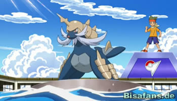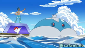 Am nächsten Morgen können Ash und Carsten Abidaya-City sowie das Meer sehen. Trotz all des Chaos haben es die beiden also doch geschafft. Gerade als sich die beiden fragen, wo die hiesige Arena ist, taucht unmittelbar vor ihnen ein Wailord mit einer Person auf dem Rücken auf. Bevor wir erfahren, was genau passiert, schwenkt die Szene zu Benny und Lilia, die sich ebenfalls in Abidaya-City befinden. Am Steg der Arena warten die beiden verzweifelt auf die Jungs, als sie ein riesiges Wailord auf sich zukommen sehen. Die beiden sind ganz schön überrascht, als sie obendrauf Ash, Carsten sowie Arenaleiter Benson sehen! Die Gruppe ist jedenfalls wieder vereint und Carsten kann gegen Benson in der Arena antreten.