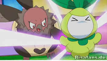 Zur Mittagszeit muss der Hortleiter kurz wegfahren und überlässt Leyla und unseren Freunden den Pokémon-Hort. Dass es Mittagszeit ist, weiß Benny, weil Ash ihn nach Essen fragt Wenig später sitzen alle im Hort und schauen den Pokémon beim Essen zu. Schnell stellt sich heraus, dass etwas nicht stimmt, denn Elfun und die anderen Pokémon können das Essen nicht verspeisen. Leyla hat vergessen die Nüsse zu knacken, damit die Pokémon das Innere essen können. Nur Geronimatz mit seinen starken Krallen kann die Nüsse problemlos knacken, was ihm viel Bewunderung, aber auch skeptische Blicke von Skallyk einbringt. Skallyk versucht daraufhin die Nuss mit seinem Schnabel zu knacken, scheitert aber und schleudert dabei versehentlich die Nuss auf Geronimatz. Geronimatz fühlt sich angegriffen, beginnt zu toben und stolpert letztlich über Laukaps, welches seinen Unmut mit einem lauten Käfergebrumm freisetzt. Nicht sehr angenehm für alle Anwesenden, die mit Windstoss, Stachelsporen und anderen Attacken reagieren Als Leyla alle zur Vernunft ruft, ergreift Skallyk die Initiative und sorgt mit kräftigen Strafattacken dafür, dass alle anderen ihre Attacken einstellen. Das führt leider dazu, dass alle nun weinen, woraufhin jedoch Meloetta ein Lied anstimmt und letztlich für Ruhe und Frieden sorgt.