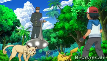 Der Plan klappt leider nur bedingt, denn wenige Schritte später spürt Pikachu eine Gefahr. Das Gefühl war richtig, denn plötzlich springt ein Snobilikat aus dem Gebüsch (was Ash mit dem Pokédex prüfen muss...). Nachdem Ash Meloetta gebeten hat, sich unsichtbar zu machen, erscheint auch der Besitzer von Snobilikat – Boss Giovanni mit Sichtbrille und auf einem Gleiter. Snobilikat greift mit Dunkelklaue an, was Pikachu jedoch erfolgreich mit einem Eisenschweif kontert. Die folgende Juwelenkraft-Attacke kommt hingegen zu überraschend und überrumpelt Ash und Pikachu. Überraschend greift sich ein Energiefeld nicht Meloetta, sondern Ash und Pikachu, die Giovanni daraufhin als Geiseln einsetzt, um Meloetta gefügig zu machen. Ein wirklich schändlicher Plan.