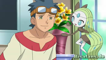 In der nächsten Szene sehen wir wieder unsere Freunde, die sich in Cynthias Ferienhaus befinden und dort mit ihren Pokémon für die Einall-Liga trainieren. Gerade findet ein Trainingskampf zwischen Benny mit Vegimak und Ash mit Ottaro statt. Hierbei greift Vegimak mit einer Kugelsaat an, die jedoch von einer Kalkklinge Ottaros abgefangen wird. Diese Aktion bringt Ash und Ottaro Lob von allen Umherstehenden zu sowie von Meloetta, was in diesem Moment wieder erscheint und zu einem Liedchen ansetzt. Was niemand ahnt: Ein Mann auf einem fliegenden Golgantes hört Meloettas schönen Gesang und fliegt deshalb zu unseren Freunden... Diese staunen aktuell aber noch über Meloettas Tanzform und dass sie gegen Ottaro in einem Trainingskampf antreten will. Ash hat damit keine Probleme und freut sich, doch Ottaro will nicht so wirklich gegen seine große Liebe kämpfen. Statt eine Wasserdüse auszuführen, wird es rot im Gesicht und versteckt sich bei Ash. Dieser ruft daraufhin Rabigator, welches keinen Probleme mit einem Trainingskampf hat.
