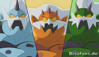 Während sich das Schiff unserer Freunde dem Tempel nähert, zog dort ein Sturm auf und ein Lichtstrahl schaffte eine Art Portal im Himmel. Aus insgesamt drei dieser Portale steigen nun Boreos, Voltolos und Demeteros auf. An dieser Stelle sei angemerkt, dass keiner unserer Freunde in den Pokédex schauen braucht, um diese zu erkennen! Team Rocket Boss Giovanni befiehlt dem Wahrspiegel nun die wahre Form der drei Pokémon zu offenbahren. In diesem Moment gelingt es Pikachu den Energiekäfig mit mehreren Eisenschweifen aufzubrechen und sich sowie Ash zu befreien. Beide eilen sofort zu Meloetta, um es aus seinem Gefängnis zu befreien, doch Jessie und James stellen sich mit Makabaja und Fleknoil in den Weg. So gelingt es ihnen, Ash und Pikachu von der Plattform des Tempels zu werfen. Ash und Pikachu haben jedoch Glück, da das Golgantes von Raffael gerade vorbeifliegt und die beiden zum Rest der Gruppe bringt. Nach kurzer Absprache, ruft Cynthia ihr Knakrack, Lilia ihr Dragoran, Benny sein Vegimak und alle machen sich auf den Weg zur oberen Plattform des Tempels um Giovanni zu stoppen. Dragoran hat es hierbei mal wieder besonders eilig und stürmt alleine vor. Golgantes mit Vegimak und Fasasnob mit Pikachu fliegen Dragoran hinterher.