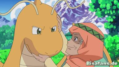 Nachdem sich unsere Freunde vorerst von Sabine verabschieden, besuchen sie die Dorfälteste, von der Lilia auch einst ihr Milza bekam. Lilia bittet sie um Entschuldigung dafür, dass sie einfach gegangen ist, doch die alte Frau lobt sie nur dafür, dass sie große Fortschritte gemacht hat und ihr Milza zeigt, dass sie sich gut um es gekümmert hat. So fragt sie Lilia, ob sie auf ihrer Reise noch andere Drachenpokémon gefangen hat und Lilia zeigt ihr und zwei weiteren Dorfbewohnern Dragoran. Dieses gerät jedoch direkt mit einem Maxax, das sich vor dem Haus der Ältesten ausruht, aneinander und die Pokémon beginnen zu kämpfen. Doch während Lilia fast in Panik gerät, bleibt die Dorfälteste ruhig und geht zwischen die beiden Drachen. Sie tätschelt erst Maxax am Bauch und drängt es zurück, ehe sie sich um Dragoran kümmert und auch es mit ruhiger Stimme und einigen Streicheleinheiten beruhigt, womit sie Ash und seine Freunde sehr beeindruckt.