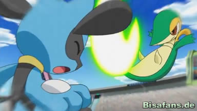 Ash muss als sechstes Pokémon Serpifeu nehmen, doch Carsten ist erst recht entschlossen zu gewinnen. Riolu fängt mit Vakuumwelle an, der Serpifeu noch ausweichen kann und mit Laubklinge wie eine Kreissäge auf Riolu zuwirbelt. Allerdings kopiert das Wellenspiel-Pokémon die Attacke und landet einen saftigen Treffer auf Serpifeu, gefolgt von einer Vakuumwelle. Serpifeu weicht ihm wieder aus, aber Riolu nutzt die Gelegenheit und packt Serpifeus Schwanz, nur um ihm eine Kraftwelle zu verpassen. Danach schleudert es es mit Überkopfwurf auf die Wand, doch das Grasschlangen-Pokémon steht noch. Es will sich nicht noch mehr gefallen lassen und setzt Blättersturm ein. Riolu weicht zwar aus, doch war dies von Ash so gewollt und Serpifeu setzt zum Rankenhieb an. Es packt Riolu am Fuß und schlägt es mehrmals auf den Boden. Doch es kann sich mit einer Vakuumwelle befreien und feuert noch eine weitere ab, der Serpifeu noch rechtzeitig mit Rankenhieb ausweichen kann und mit Blättersturm einen direkten Treffer landet.
