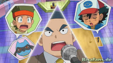 Nachdem er Stefan besiegt hat und in die vierte Runde eingezogen ist, ist Ashs nächster Gegner Carsten. Und Carsten hat als erstes Pokémon gleich seine Geheimwaffe Trikephalo gewählt, was das Publikum zum Staunen bringt. Ash holt seinen Pokédex heraus und sucht nach Informationen über Trikephalo. Danach wählt er als erstes Pokémon Sedimantur.