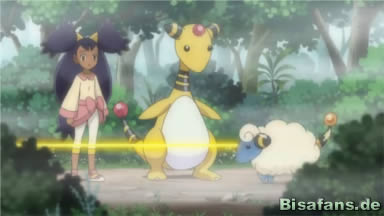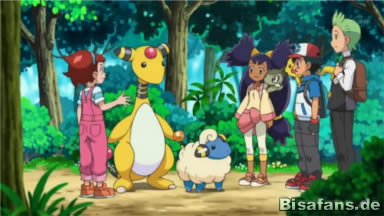 In der nächsten Szene sieht man wie ein Voltilamm die Herde verlassen möchte, Ampharos stellt sich jedoch dazwischen und dieses Mal kann es das Schafspokémon mit bloßen Blick davon abhalten – es hat es endlich geschafft! Die Vier beobachten das freudig und Ellie dankt ihnen dafür, dass sie ihr geholfen haben und nun ist sogar ihr Großvater zufrieden. Daraufhin verlassen Ash, Lilia und Benni die Farm, sie verabschieden sich und machen sich auf in ihr nächstes Abenteuer!