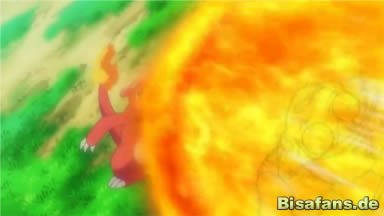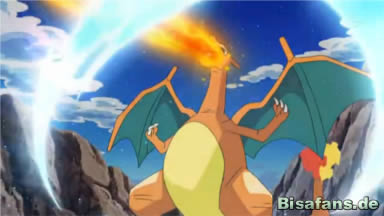 Ash fragt Glurak ob es wieder mit ihm reisen würde und Glurak sagt feuerspeiend zu!