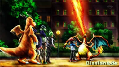 Ash befiehlt Glurak Drachenrute einzusetzen, Dragoran flüchtet in die Luft, doch Glurak fliegt hinterher und schießt es mit dem Angriff zurück auf den Boden. Die beiden sehen sich an, wollen weiterkämpfen, doch N geht dazwischen und sagt, der Kampf sei vorbei. Er meint, nun haben die beiden Stärken und Schwächen ihres Gegners kennengelernt und das würde reichen – alle stimmen nach kurzer Überraschung zu.