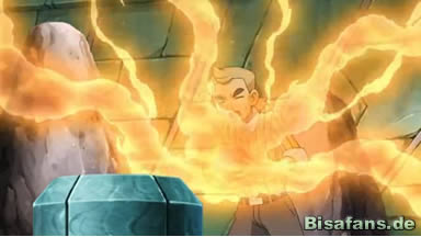 N sieht den Strahl von Weitem. Er verabschiedet und bedankt sich beim Kronjuwild, das ihn dorthin gebracht hatte. Auch Team Plasma beobachtet die merkwürdigen Flammen von weiter weg. Nick, Benny, Ash und Lilia eilen zu Professor Esche und erkundigen sich nach seinem Wohlbefinden, doch er hat keine Schäden genommen.
