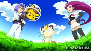 Jessie und James machen sich inzwischen mit dem Heißluftballon auf die Suche nach Mauzi. Schnell haben sie die Gruppe mit den vier Pokémon gefunden und wollen Mauzi helfen, doch streift da der Ballon einen Baum, sodass einige Bibor aufgescheucht werden, die den Ballon zerstören und Jessie und James somit einen Abflug machen.
