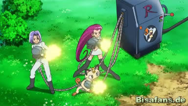 Doch schließlich verschwinden die Rotom in Richtung der Bäume, hinter denen sich natürlich Team Rocket breitgemacht hat. Natürlich nicht ohne eine ihrer bizarren Apparaturen im Schlepptau. Nachdem Team Rocket sein Motto aufgesagt hat, offenbart sich schließlich deren Gerät. Sie wollen die Rotom mit Strom, den sie aus den Strommasten abgezapft haben, anlocken und schließlich in einem Behälter einsperren. Dies gelingt auch, zum Leidwesen der Freunde und des Professors, mit einem Rotom.