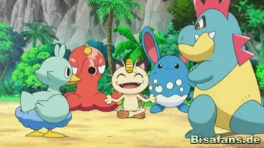 Mauzi will inzwischen das Vertrauen der Piraten gewinnen, indem es erklärt, dass auch Team Rocket böse ist und sie daher Kollegen sind. In diesem Moment erreicht das Polizeiboot die Insel, weshalb sich Mauzi versteckt. Officer Rocky und die Kinder wollen schließlich wissen, weshalb die Wasser-Pokémon die Diebstähle begangen haben und Mauzi taucht wieder auf, um zu übersetzen. So erzählen die Pokémon, dass sie alle von ihren Trainern aus unterschiedlichen Gründen verlassen wurden. Danach hatten sie alle große Probleme, bis sie einander getroffen haben. Seitdem wollen sie es den Menschen heimzahlen.
