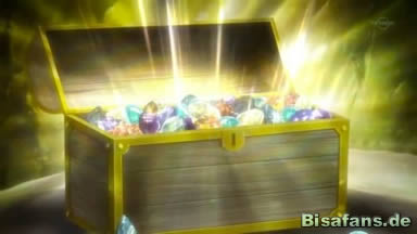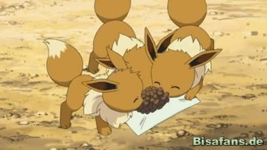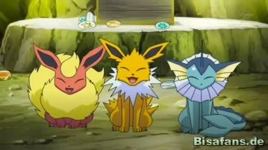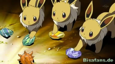 Im Gang schlussendlich finden unsere Freunde schlussendlich eine Truhe, die sehr nach einem Piratenschatz aussieht. In deren Inneren befinden sich wider Erwarten jedoch beinahe alle Steine, mit denen sich Pokémon weiterentwickeln können. Und dabei bemerken sie auch, dass es sich bei den Pokémon auf der Insel um sämtliche steinabhängige Evolutionen handelt. Diese scheinen den Piratenschatz bis heute hin vereint zu beschützen. Auch die drei Evoli berühren daraufhin jeweils einen der Steine und entwickeln sich zu Aquana, Blitza und Flamara. Eguana schließlich überredet Alba, das Video der Schatzsuche zugunsten der Pokémon auf der Insel zu löschen.