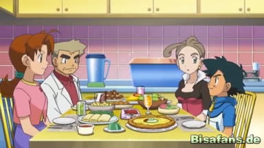 Später beschließt Delia, Professor Eich und Alba zum Abendessen einzuladen, doch als Ash nur einsilbige Antworten gibt, erlaubt sie ihm, zu seinen Pokémon im Labor zu gehen.