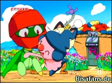 In diesem Moment tauchen Jessie, James und Mauzi von Team Rocket mal wieder auf um die Beeren von Forsythias Feldern mit einem neuen Ernte-Roboter zu stehlen. Mit Pudox, Venuflibis und Tuska greift Team Rocket an, doch unsere Freunde wehren sich mit ihren Pokémon dagegen. Im Kampf flüchtet das Roserade von Forsythia um sich im Haus zu einem maskierten Roserade zu verkleiden. Als es draußen eng wird für unsere Freunde, taucht das maskierte Roserade auf um Team Rocket an der Flucht zu hindern. Wie wir erfahren, gewinnt Roserade Superkräfte, wenn es sich mit dem Tuch verkleidet. Entsprechend versucht Mauzi dem Roserade seinen Schal zu nehmen. Mit Pantimimis Hilfe (Spaßkanone) gelingt es sogar. Team Rocket nimmt sogar Roserade mit. Doch Forsythia stellt sich dem Ernteroboter in den Weg und ermuntert Roserade, dass es auch ohne Schal so stark ist.