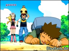 Unterwegs gibt es aber ein weiteres Treffen mit Team Rocket (wird langsam rekordverdächtig...), die sich als Sandverkäufer verkleidet haben um Hippopotas zu fangen. Dank eines Gähners von Hippopotas und Attacken von Chelast sowie Pikachu bekommen Jessie, James und Mauzi eine weitere Abreibung.
