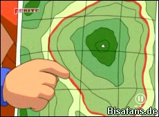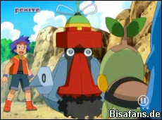 Rocko schlägt vor Voluminas m it einem starken Stromstoß von Pikachu zu "wecken". Dies klappt jedoch nicht richtig und Voluminas flüchtet in den Wald, gefolgt von Alan. Diesem gelingt es auf Voluminas zu springen, während Pikachu und Pachirisu weiter Elektro-Attacken einsetzen. Diese werden auch von Bamelins Aquaknarre unterstützt. Alle diese Attacken und Alans großer Einsatz sorgen letztlich dafür, dass der beschädigte Manipulator entfernt werden kann. Unglücklicherweise fiel Voluminas bei der letzten Attacke in den Fluß und liegt nun auf dessen Boden, während Team Rocket am Strand unsere Freunde angreift.