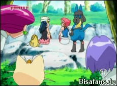 Gemeinsam mit ihrem Lucario will sie nun zu sich finden und zieht sich zurück. Während Ash mit Reggie redet, erzählt Lucia Hilda von ihren Niederlagen beim Wettbewerb. Hilda macht sich Vorwürfe, dass sie keine angemessene Lehrerin für ihre Schüler mehr sein kann, obwohl diese sie immer noch mögen und auch Lucia macht sich Vorwürfe, dass sie Ash ausbremsen könnte. Mitten im Gespräch tauchen Jessie, James und Mauzi von Team Rocket auf um Lucario abzuwerben. Trotz Bestechungsversuchen wie Schokolade, Kronkorken oder Ballonfahrten, regelt Lucario dies indem er Team Rocket eine Abreibung verpasst.