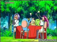 Das Essen ist nicht mehr zu retten, da Jessie, James und ihre Pokémon fast alles schnell in sich stopfen. Nur in einem Kühlschrank neben Team Rockets Lager könnte noch etwas zu Essen sein. Da Team Rocket diesen nicht rausrücken will, greifen Haspiror und Glaziola an und erledigen Team Rocket im Handumdrehen.