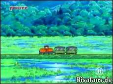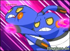 In einer Zwischenszene mit Team Rocket sehen wir übrigens, dass James sein Venuflibis hier im Großmoor erhielt. Er rettete es als kleiner Junge aus einer Matschpfütze, was dazu führte, dass ihm das Venuflibis so dankbar war, dass es ihn seit dem immer umarmt. Jessie und Mauzi ist dies nicht so wichtig – diese wollen viel lieber auch am Glibunkel-Wettbewerb teilnehmen und zwar mit Mauzi in einer Glibunkel-Verkleidung. Ob das gut geht?