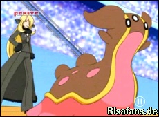 Cynthias Knakrack eröffnet die Episode mit der Attacke Kriegstanz gegen Herbaros Piondragi. Natürlich geht es hier um die Titelverteidigung von Cynthia, die in den letzten Episoden schon angekündigt wurde. Unsere Freunde treffen gerade in der Arena ein, in der dieser Kampf stattfindet. Anwesend ist auch Paul, der alles sorgfältig studiert.