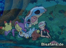 Nun müssen alle Helfen, auch Ambidiffel hilft beim Zerschneiden von Ästen mit, ein Bett für den Kranken aufzubauen. Lucia weiß, sie muss sich um Mamutel kümmern. Nur dann kann es einem Pokémon gut gehen, wenn auch sein Trainer sich um nichts anderes kümmert und ihm Mut zuspricht.