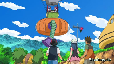Für Ash, Lucia und Rocko bedeutet dies vorerst eine Zwangspause, doch die schöne Landschaft um sie herum lädt geradezu zu einem Picknick mit ihren Pokémon ein. Ihre Ruhe wird ziemlich bald gestört, denn auch Team Rocket nutzt die Pause – natürlich um an die Pokémon der Knirpse heranzukommen. Dabei versuchen sie es diesmal wieder mit der klassischen Ballonsauger-Methode. Doch als der Lokführer das diebische Trio bemerkt, hetzt er sofort sein Ampharos auf sie und die meisten Pokémon können sich befreien. Fast alle, denn Pikachu, Plinfa und Wonneira bleiben zurück. Als Ampharos auch sie zu retten versucht, reißt der Ballon auseinander und die vier Pokémon werden mit samt Team Rocket in den Wald in der Umgebung geschleudert.